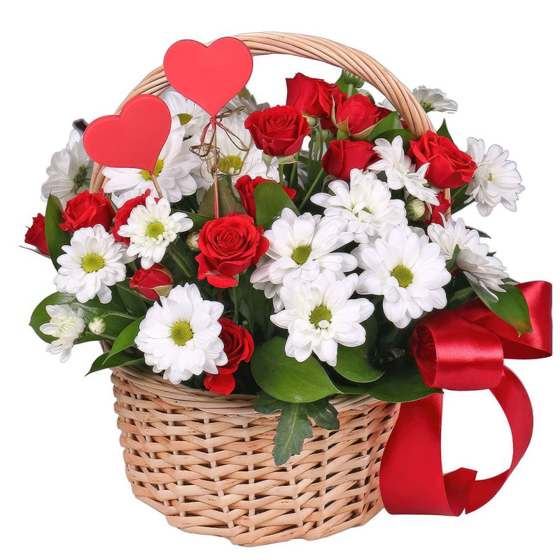 Эта композиция вызывает радость и восхищение благодаря контрасту белых кустовых хризантем и красных одноголовых роз. Цветы аккуратно расположены в плетёной корзине с яркой красной лентой, что придаёт ей праздничность. Композиция создаёт атмосферу нежности и любви. Прекрасно подойдёт для подарка любимой женщине на День Святого Валентина.