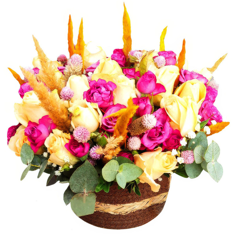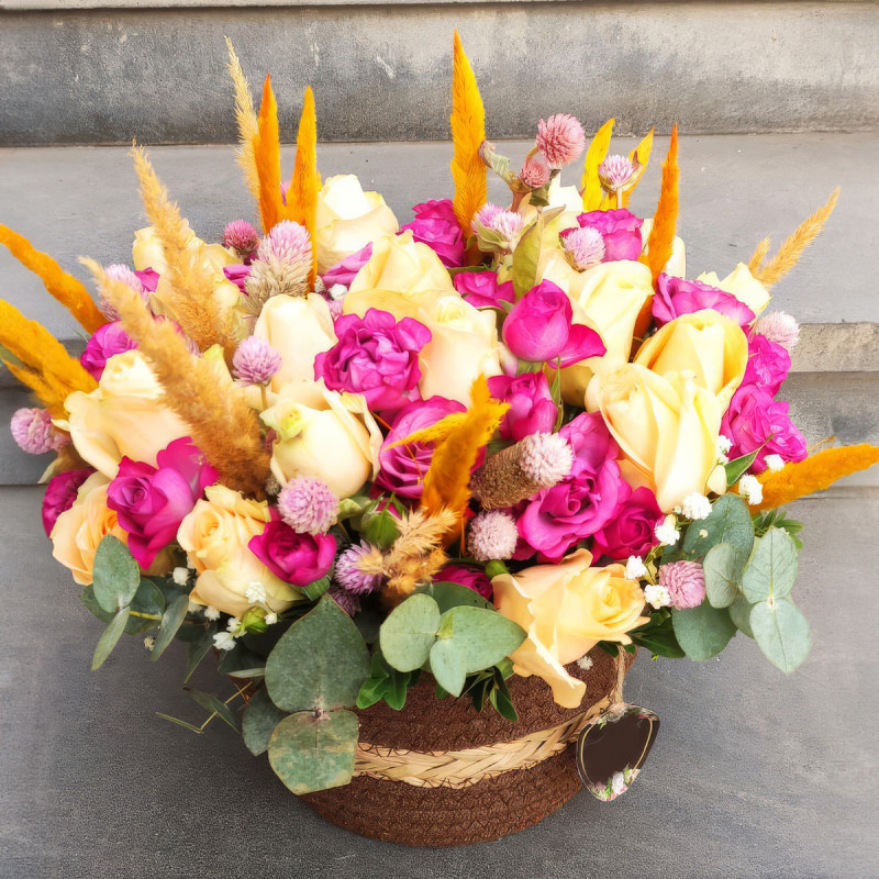 Эта композиция покоряет сочетанием кремовых и розовых оттенков, создавая ощущение нежности и гармонии. В корзине собраны кремовые и розовые одноголовые розы, гипсофила, сухоцветы и эвкалипт. Плетёная корзина с изящной лентой добавляет изысканности и завершенности образу. Она создаёт атмосферу романтики и уюта, идеально подходя для подарка на День семьи, любви и верности для подруги.
