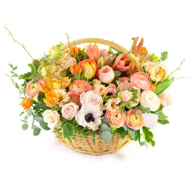 Эта композиция вызывает светлые и теплые эмоции благодаря нежной цветовой гамме. В состав входят белый анемон, кремовый ранункулюс, розовая кустовая роза, оранжевый тюльпан, кремовая эустома, гиппеаструм, маттиола персиковая, а также зелень фисташки, бересклета, корелиуса и эвкалипта. Цветы размещены в плетёной корзине, создающей уют и гармонию. Композиция создаёт атмосферу радости и весны, идеально подойдет для поздравления учительницы на День знаний.