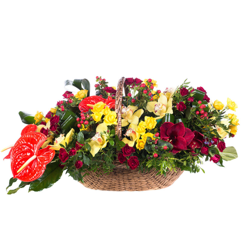 Яркая палитра красных и желтых оттенков орхидей и кустовых роз сразу привлекает внимание. В композиции также присутствуют антуриум, гиперикум и аспидистра. Плетёная корзина придаёт изысканность и завершенность. Такая композиция создаёт атмосферу торжества и радости, идеально подойдёт для подарка на День знаний для учительницы.