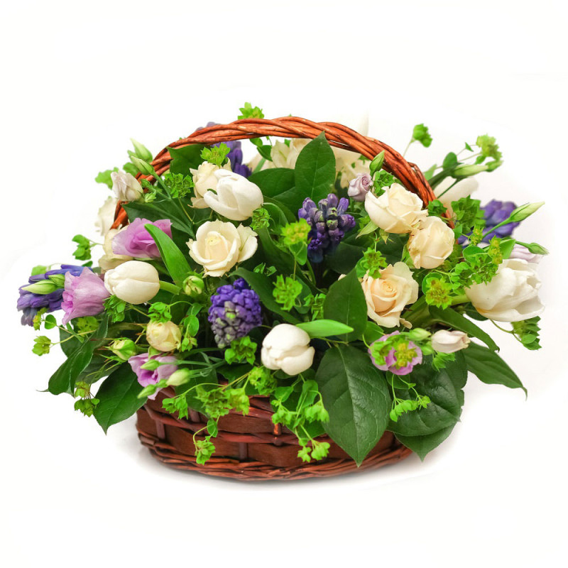 Эта композиция в нежных кремовых и сиреневых тонах создаёт атмосферу весеннего пробуждения. В её составе кремовые кустовые розы, белые тюльпаны, гиацинты, сиреневые эустомы, буплерум и салал. Цветы аккуратно размещены в плетёной корзине с оазисом, что сохраняет их свежесть. Это идеальный подарок на выпускной вечер для учительницы.