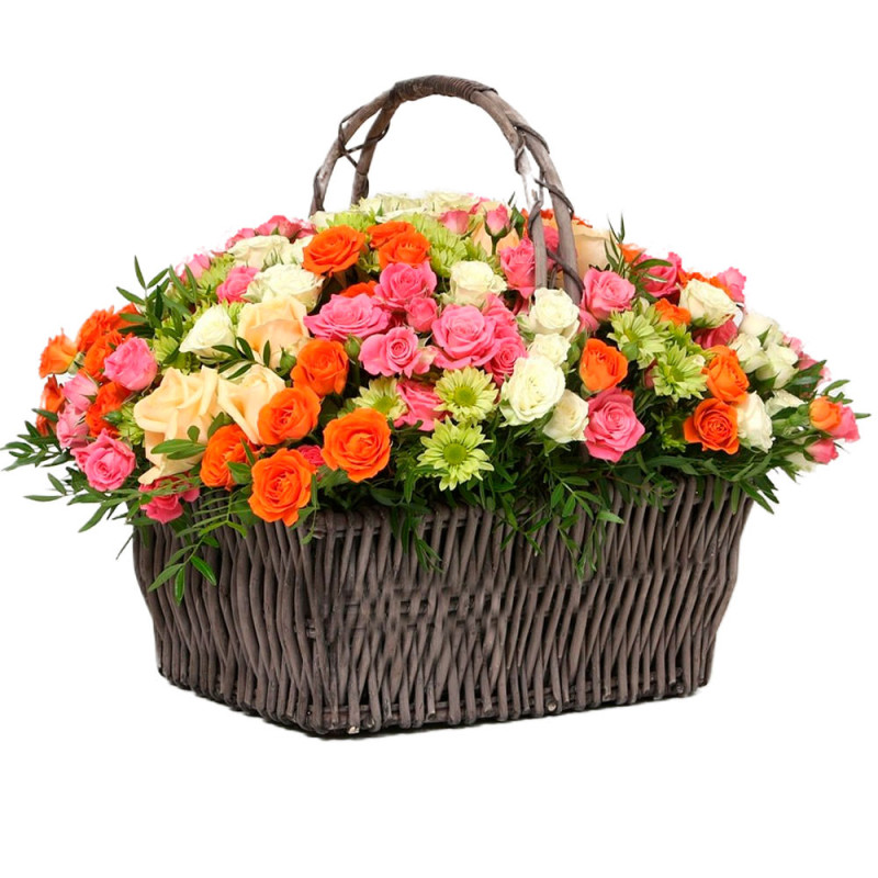 Эта цветочная композиция покоряет своей яркостью и свежестью. В составе белые, оранжевые и розовые кустовые розы, зеленая кустовая хризантема и фисташка. Композиция оформлена в плетёной корзине с оазисом, что придаёт ей устойчивость и изысканность. Прекрасно подойдёт для создания праздничной атмосферы на защите диссертации и станет отличным подарком для руководителя.