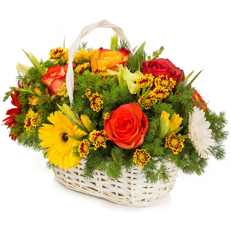 Яркие и жизнерадостные оттенки оранжевых роз и желтых гербер создают атмосферу праздника. В составе композиции: оранжевая роза одноголовая, желтая, красная и белая гербера, жёлто-красная кустовая хризантема и жёлтый гладиолус, дополненные зеленью. Плетёная корзина белого цвета подчёркивает свежесть и оригинальность букета. Эта композиция станет прекрасным подарком для крестного на юбилей, создавая тёплую и радостную атмосферу.