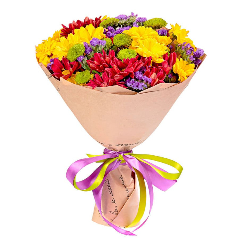 Радостные оттенки желтого, красного и зеленого создают атмосферу праздника. В букете использованы кустовые хризантемы микс (желтые, красные, зеленые) и статица. Упаковка из крафт-бумаги с матовой пленкой, украшена яркими декоративными лентами. Букет идеально подойдет для подарка на День города для любимой женщины.
