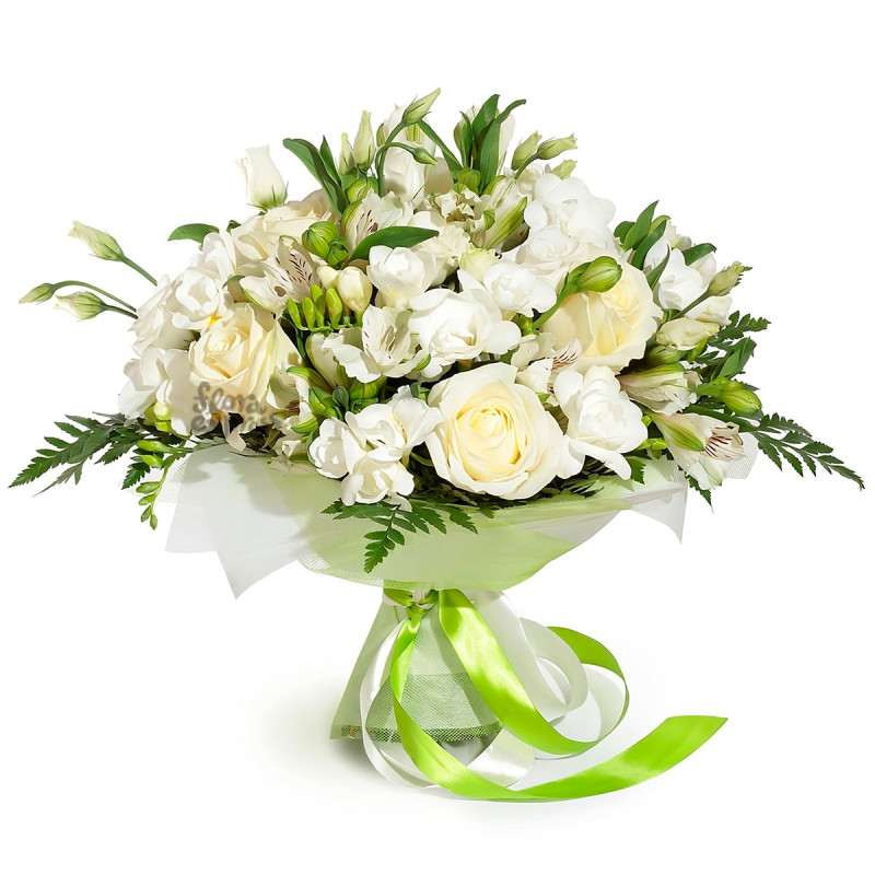 Этот букет в белоснежных тонах наполнен нежностью и элегантностью. В его состав входят фрезия белая, одноголовая белая роза, белая альстромерия, белая эустома и зелень. Упакован в матовую пленку с акцентом на зелёной атласной ленте. Прекрасно создаёт атмосферу утончённости и изысканности. Идеально подойдёт для поздравления мамы на День матери.