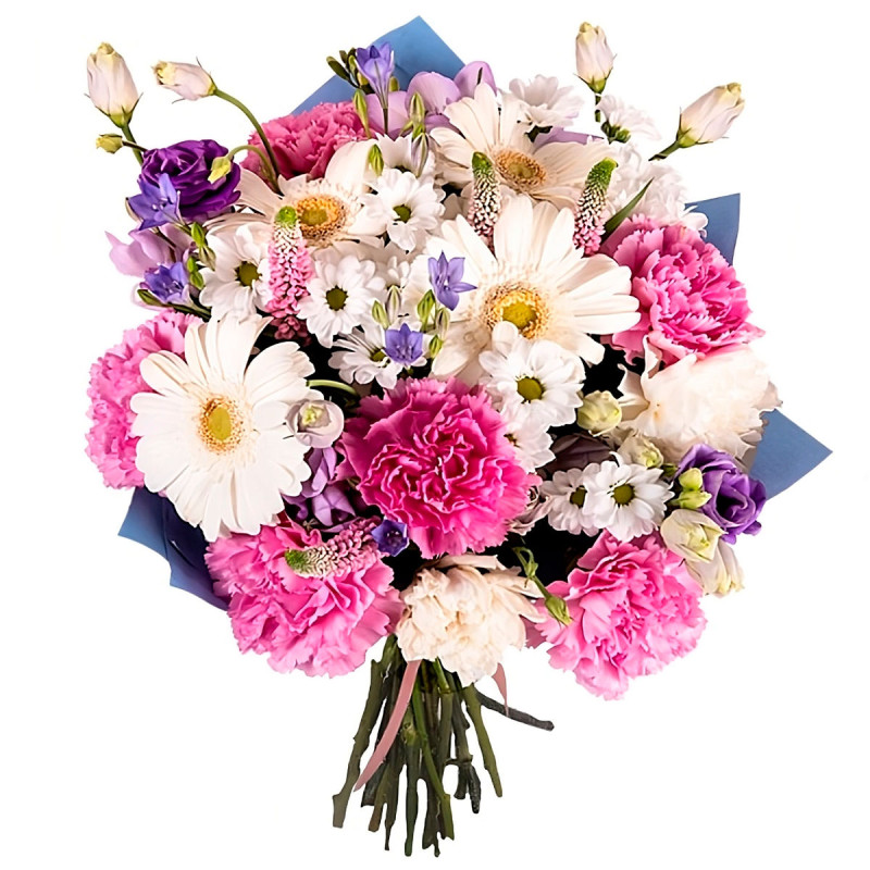 Этот букет радует нежными оттенками белого, розового и сиреневого. В составе гербера белая, хризантема кустовая белая, гвоздика розовая и белая, фрезия сиреневая, вероника и эустома фиолетовая и розовая. Упакован в матовую плёнку с изысканной лентой. Создаёт атмосферу лёгкости и радости. Идеально подойдёт для встречи выпускников, чтобы порадовать коллегу.