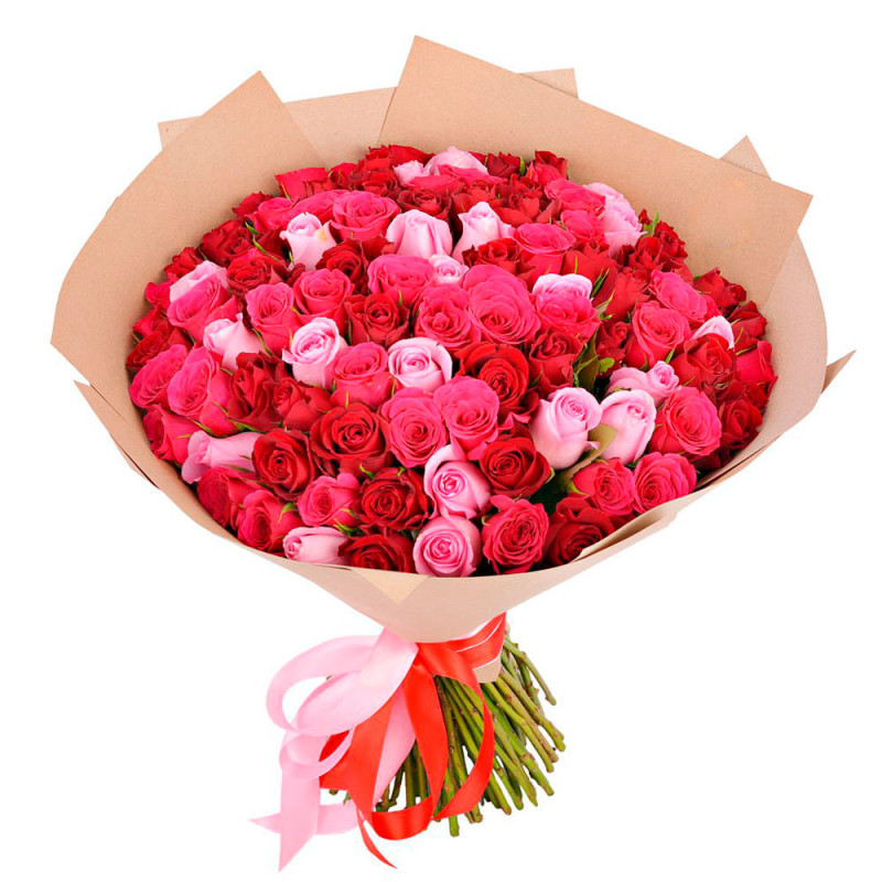 Яркие оттенки розового и красного создают атмосферу нежности и страсти. Букет составлен из розы одноголовой и кустовой розы микс в нескольких оттенках розового. Упакован в крафт-бумагу с матовой плёнкой, дополненный атласной лентой красного и розового цветов, завязанной в пышный бант. Этот букет создаёт атмосферу романтики и тепла. Идеальный подарок для любимой женщины на День Святого Валентина.