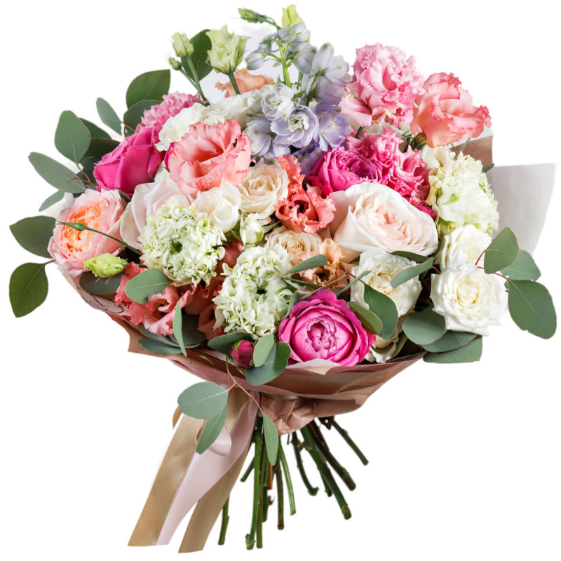 Очаровательная композиция в нежных розовых и персиковых тонах создаёт атмосферу утончённой гармонии. В букете представлены роза пионовидная розовая, персиковая и белая, розовая эустома и эвкалипт. Упакован в элегантную крафт-бумагу с матовой плёнкой, перевязанную атласной лентой. Идеально подойдёт для романтического вечера для любимой женщины.