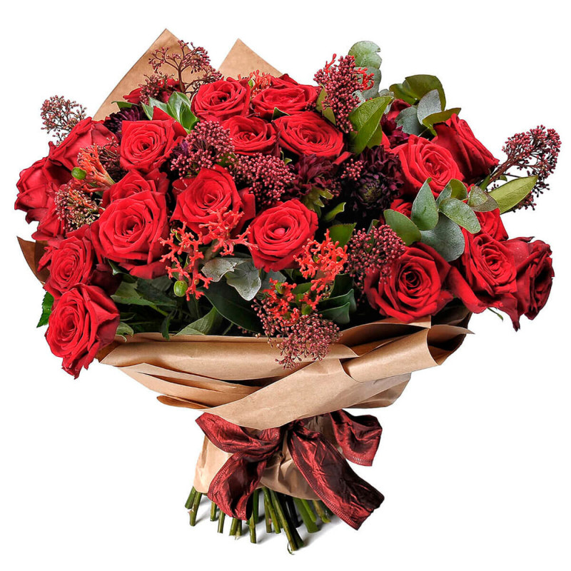 Яркие красные розы вместе с декоративной зеленью и озотамнусом создают впечатляющую композицию. Букет оформлен в крафт-бумагу и перевязан насыщенной бордовой лентой. Эта композиция дарит атмосферу страсти и элегантности. Прекрасный выбор на серебряную свадьбу для любимой женщины.