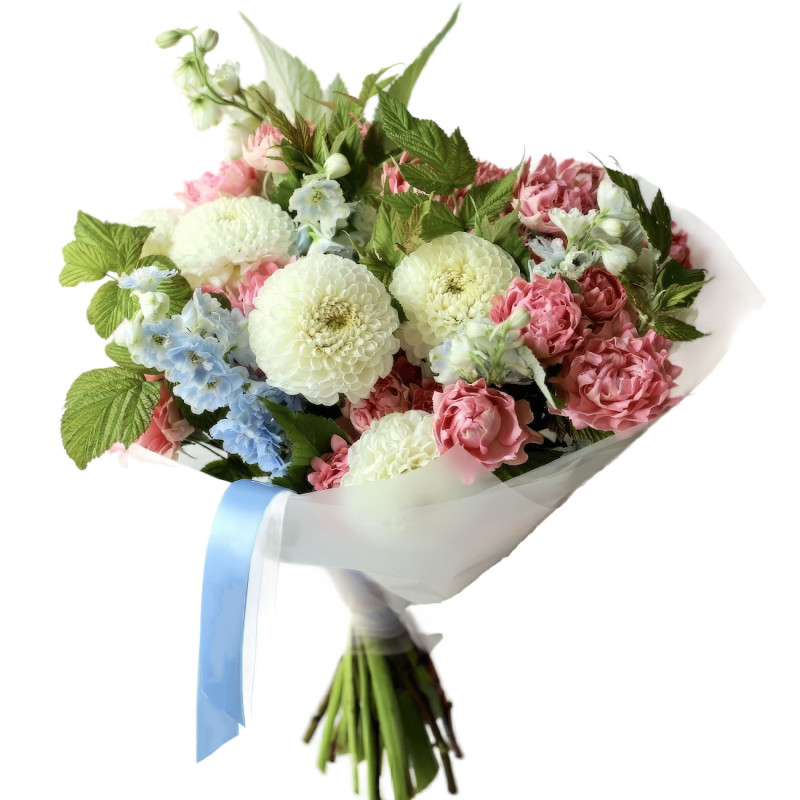 Нежные белые георгины, голубая маттиола и розовые кустовые розы создают атмосферу лёгкости и утончённости. Композиция дополнена свежими зелёными листьями малины. Букет оформлен в матовую плёнку с голубой лентой, что подчёркивает его элегантность. Идеально подойдёт на годовщину для руководства, создавая торжественную атмосферу.