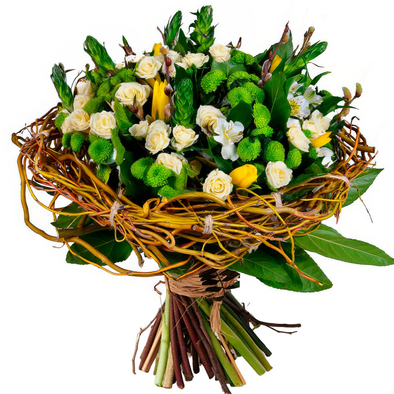 Яркий и жизнерадостный букет в теплых желто-зеленых тонах. В композиции использованы желтые кустовые розы, зеленые кустовые хризантемы, белые альстромерии и желтые тюльпаны, дополненные зеленью. Букет оформлен в каркас из натуральных веток, что придает ему неповторимый шарм. Создает атмосферу радости и свежести. Идеальный подарок для любимой женщины на день рождения.