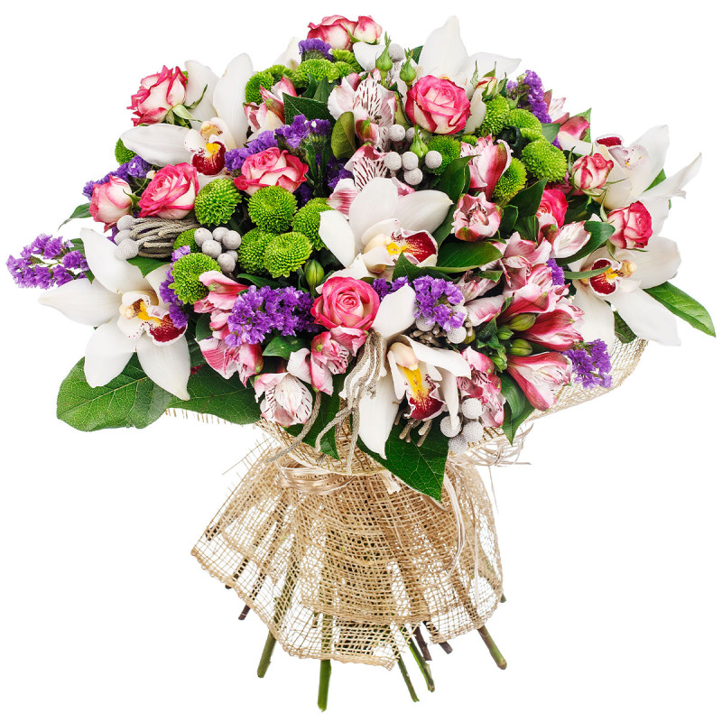 Яркий и жизнерадостный букет в бело-розовой гамме с акцентами фиолетового и зеленого. В составе белая орхидея, бело-красная альстромерия, розовая кустовая роза, зеленая хризантема, фиолетовая статица и бруния. Упакован в крафт-сетку, завязанную бежевой лентой. Создаёт атмосферу свежести и радости. Подходит для поздравления мамы на День рождения.