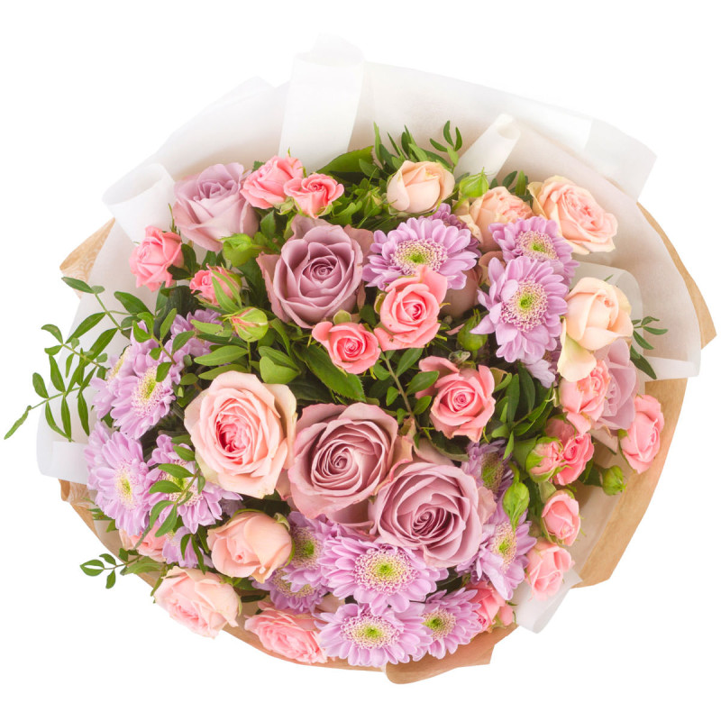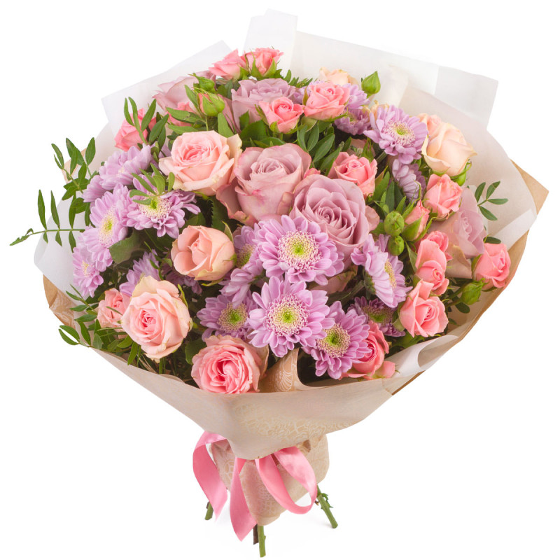 Этот букет очаровывает нежностью сиреневых и розовых оттенков. В его составе роза одноголовая сиреневая, роза кустовая розовая и хризантема кустовая сиреневая, дополненные фисташкой. Упакован в крафт-бумагу с белыми вставками и перевязан розовой атласной лентой. Создаёт атмосферу утончённости и лёгкости. Идеально подойдёт для поздравления сестры на День матери.