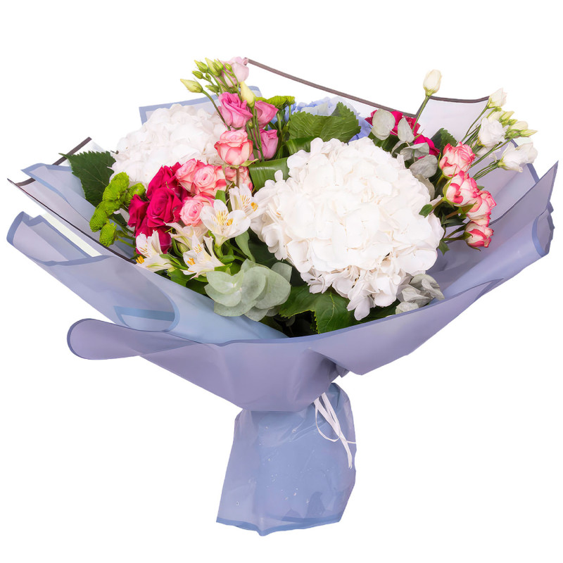 Букет завораживает своей нежной палитрой: белая гортензия, розовая эустома, белая альстромерия, розовые и бело-розовые кустовые розы, эвкалипт, сантини и аспидистра. Композиция аккуратно уложена в крафт-бумагу и обвита декоративной лентой. Этот букет создаёт атмосферу элегантности и утончённости. Идеально подойдёт для поздравления начальницы на повышение.