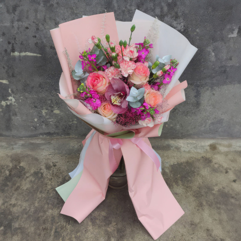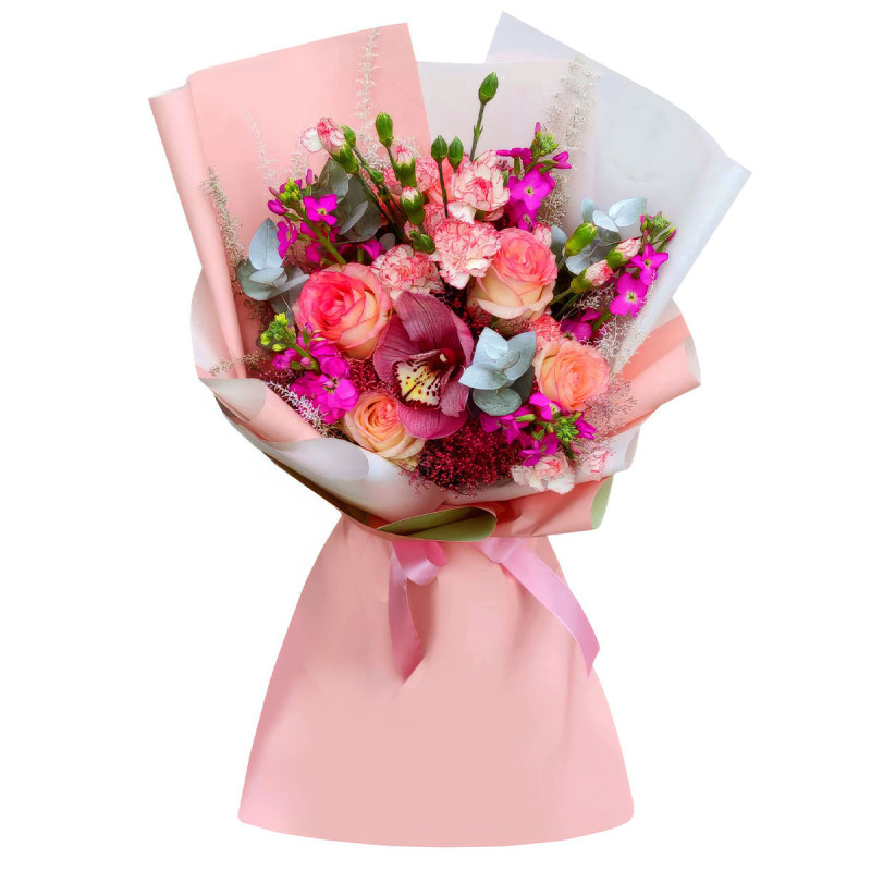 Этот букет очаровывает розово-сиреневой палитрой, создавая атмосферу нежности и радости. В составе розовая орхидея, розовая одноголовая роза, розовая кустовая гвоздика, сиреневая маттиола и эвкалипт. Композиция оформлена в матовую плёнку с розовой атласной лентой. Подойдёт для поздравления любимого человека на 14 Февраля, особенно для девушки.