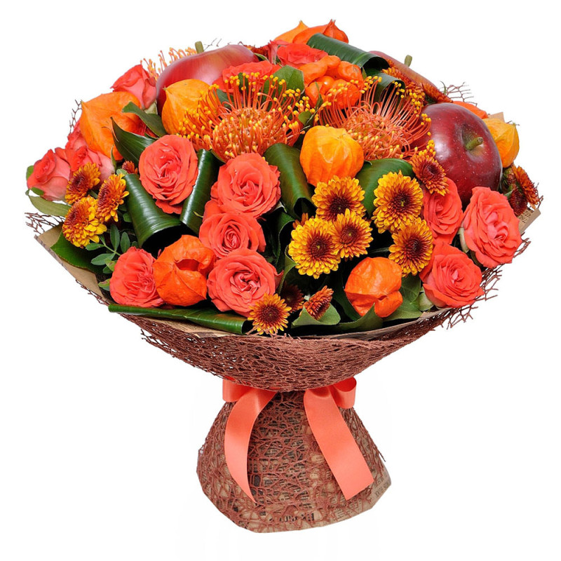 Яркие оранжевые и жёлтые оттенки создают атмосферу радости и тепла. Композиция включает оранжевые кустовые розы, ликорис, жёлтые кустовые хризантемы, физалис и аспидистру. Букет оформлен в крафт-бумагу и сетку, украшен оранжевой лентой. Идеально подойдет для празднования на 8 Марта, чтобы порадовать любимую женщину.