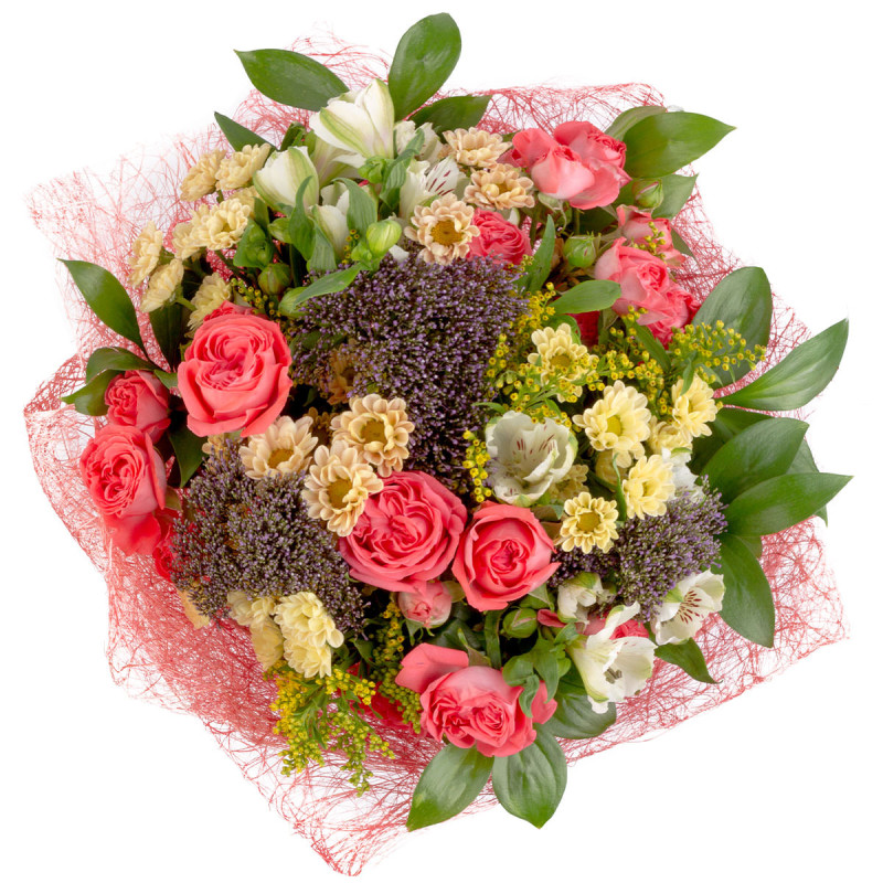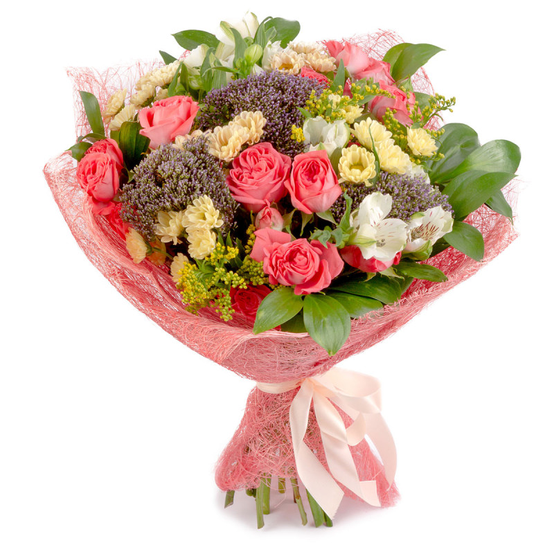 Яркое сочетание розовых кустовых роз, белоснежных альстромерий, фиолетового трахелиума и желтых хризантем создаёт атмосферу радости и тепла. Дополняет композицию солнечный солидаго. Букет оформлен в декоративную сетку с атласной лентой, что придаёт ему изысканности. Этот букет станет отличным подарком для руководителя на день рождения, создавая праздничное настроение.