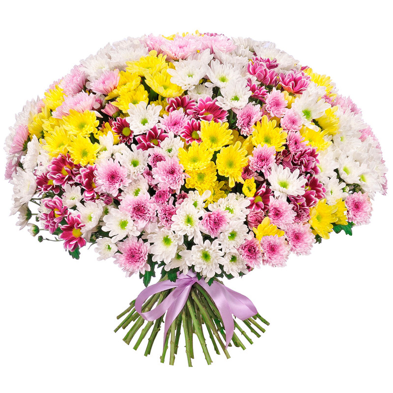 Кустовая хризантема ассорти из розовой, белой, желтой и фиолетовой можно купить в интернет-магазине - kupit-buketu.ru. Только молодые цветы. Более 50 вариантов упаковок. Букеты формируют более 60 флористов.