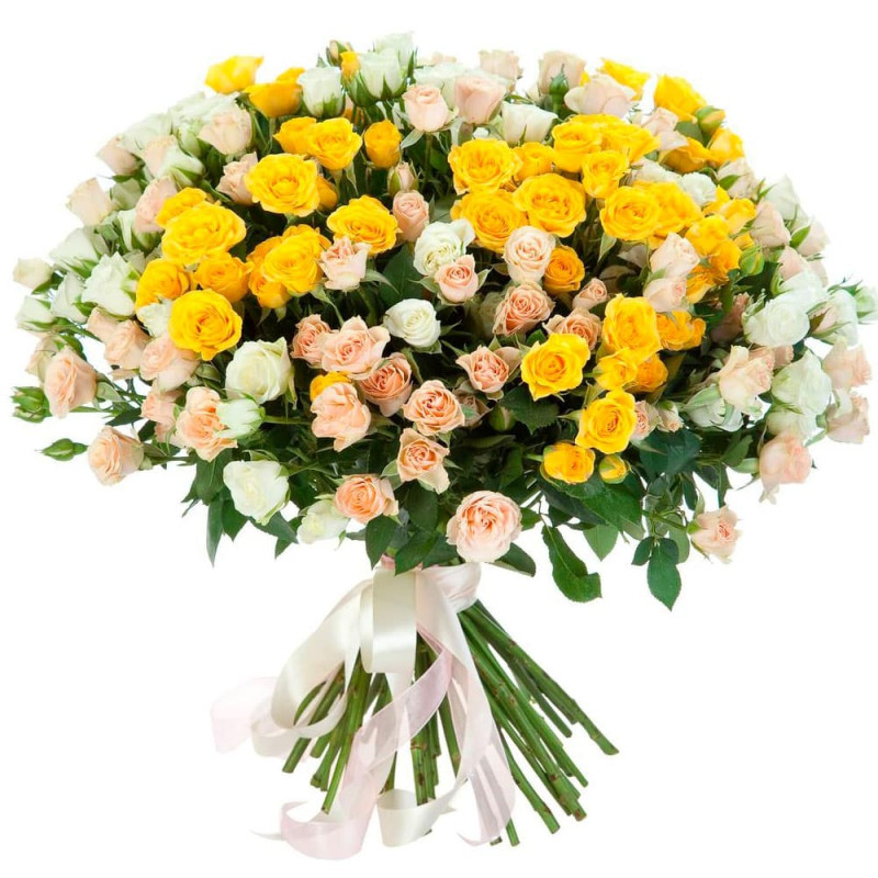 Кустовая роза ассорти из желтой, бежевой и белой можно купить в интернет-магазине - kupit-buketu.ru. Только свежайшие цветы. Уже 50 дизайнов упаковок. Букеты оформляют более 50 флористов.