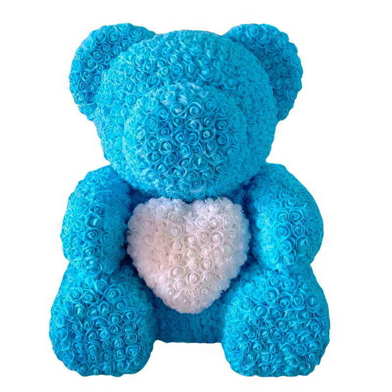 Мишка из роз голубой с белым сердцем — созданный из более чем 800 великолепных 3D розочек.