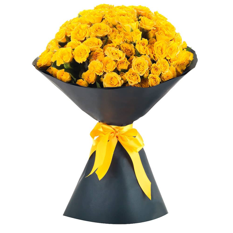 Яркие и жизнерадостные оттенки желтых кустовых роз создают атмосферу тепла и радости. В букете исключительно розы кустовые желтые. Упаковка выполнена из черной матовой пленки, украшенной яркой желтой атласной лентой. Этот букет приносит ощущение солнечного настроения и подходит для поздравления начальницы на юбилей.