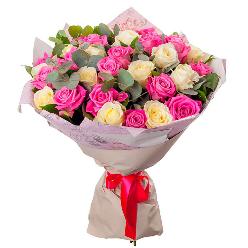 Этот букет вызывает чувство нежности благодаря сочетанию кремовых и розовых оттенков. В композиции присутствуют розы и эвкалипт, завернутые в матовую пленку и крафт-бумагу, украшенные красной атласной лентой. Такая композиция создаёт атмосферу романтики и подходит на свидание для любимой женщины.
