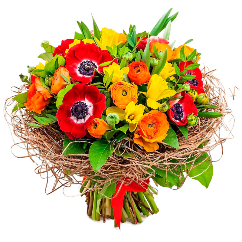 Яркие красные маки, жёлтые нарциссы и оранжевые мини-ранункулюсы создают радостное настроение. Композиция дополнена зеленью салала и фисташки. Упаковка из натуральной декоративной сетки добавляет изысканности. Этот букет создаст атмосферу весеннего праздника. Идеально для поздравления начальницы на День Святого Валентина.