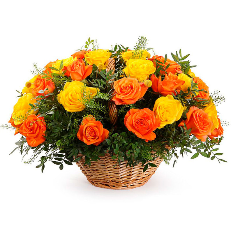 Яркие жёлтые и оранжевые розы в сочетании с зеленью микс создают атмосферу радости и тепла. Композиция оформлена в плетёной корзине с оазисом, что обеспечивает свежесть и натуральность. Этот букет станет замечательным подарком для девушки на День Святого Валентина, наполняя пространство романтикой и нежностью.