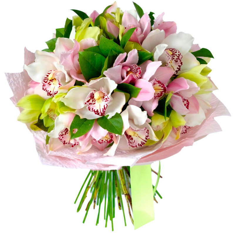 Орхидея ассорти из белой, розовой и зеленой можно купить в интернет-магазине - kupit-buketu.ru. Только свежайшие цветы. Уже 40 стилей упаковок. Букеты оформляют более 70 флористов.
