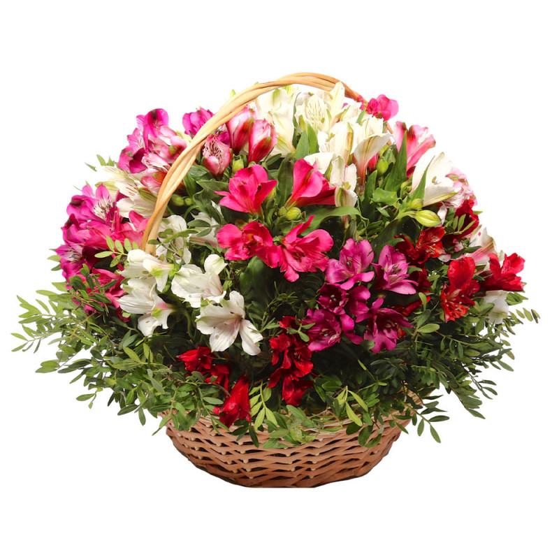 Яркие оттенки белых, розовых и бордовых альстромерий создают атмосферу радости и свежести. В составе букета альстромерия микс и фисташка. Композиция оформлена в плетёной корзине с удобной ручкой. Подарок идеально подойдёт для поздравления партнёрши на долгожданную встречу.