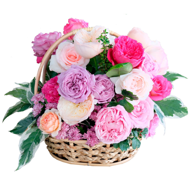 Эта композиция дарит нежность и романтику благодаря розовой цветовой палитре. В ней сочетаются роза одноголовая пионовидная розовая, роза кустовая розовая и хризантема кустовая розовая мини. Оформлена в плетёной корзине, создающей уют и стиль. Подойдёт для поздравления подруги на день рождения или для романтического вечера.