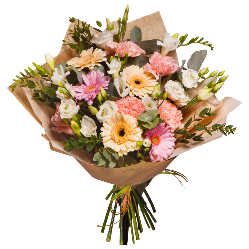 Букет погружает в атмосферу нежности с розовыми и персиковыми герберами, белыми эустомами и фрезиями, розовыми гвоздиками, дополненными зеленью эвкалипта и фисташки. Композиция оформлена в крафт-бумагу, которая подчёркивает её естественный шарм. Такой букет создаёт романтическую атмосферу и станет отличным подарком для любимой на годовщину.