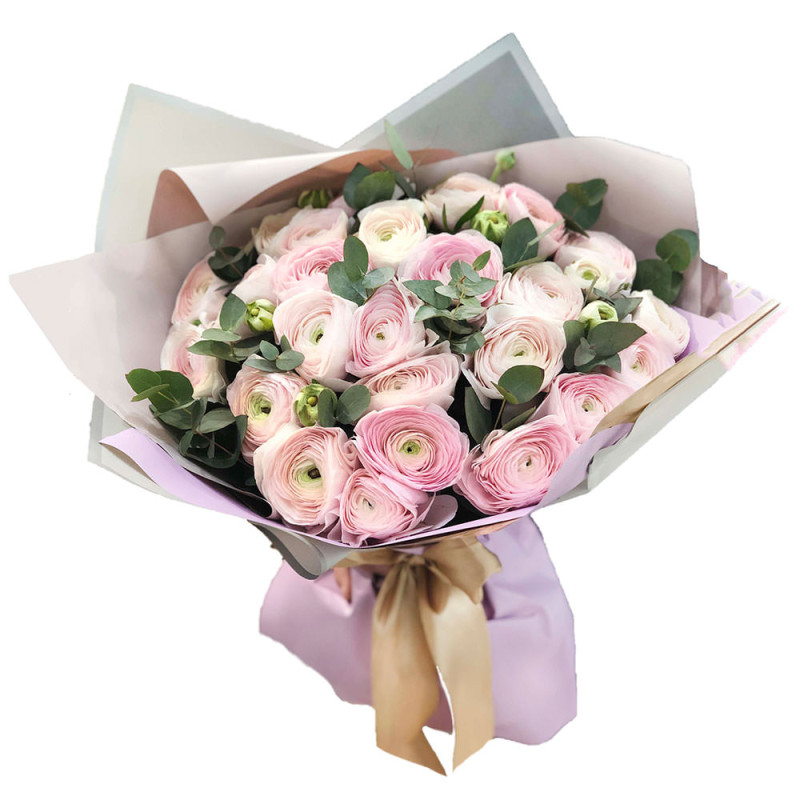 Нежные розовые и белые оттенки букета дарят чувство романтики и легкости. В составе изысканные ранункулюсы и свежий эвкалипт. Упаковка выполнена из матовой пленки и крафт-бумаги, украшена широкой атласной лентой. Композиция создаёт атмосферу элегантности и утончённости. Прекрасный подарок для любимой женщины на романтический вечер.