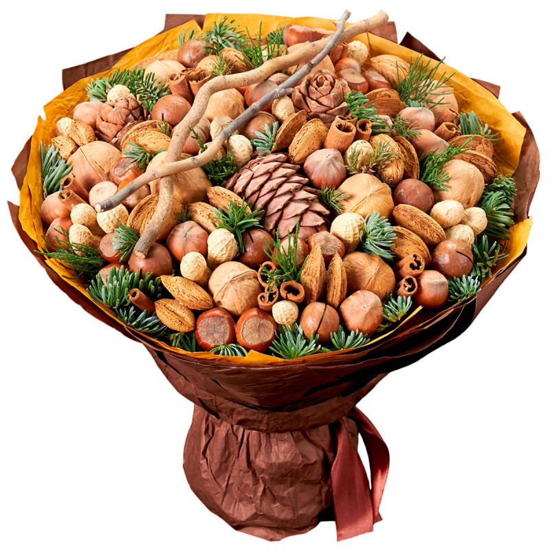 Тёплая цветовая гамма создаёт уют и комфорт. В составе грецкий орех, макадамия, фундук, арахис, корица, хвоя и шишки. Букет оформлен в крафт-бумагу с матовой плёнкой, перевязан красной лентой. Создаёт атмосферу лесной сказки. Идеален для подарка начальнику на день рождения.