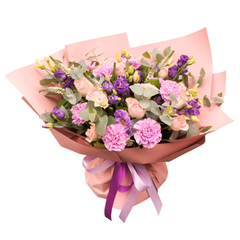 Элегантная композиция в сиренево-розовых тонах вызывает ощущение лёгкости и утончённости. В букете представлены сиреневая гвоздика, белая эустома, розовая роза, вероника и эвкалипт. Упакован в матовую плёнку нежного розового цвета, дополненную атласной лентой. Этот букет создаст атмосферу спокойствия и идеально подойдёт для встречи из поездки, порадует дяде.