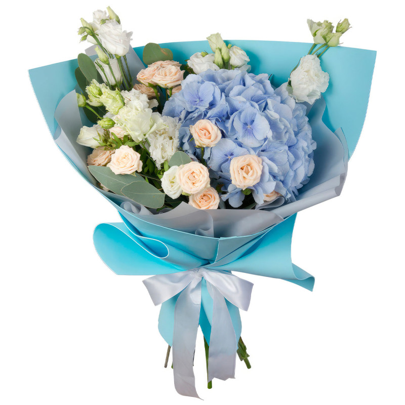 Свежий набор нежных тонов с белым лизиантусом, кремовой кустовой розой и голубой гортензией. Элементы эвкалипта добавляют изысканности. Упакован в стильную голубую бумагу с матовой плёнкой, украшенной аккуратно завязанной лентой. Создаёт атмосферу утончённой элегантности. Подойдёт для поздравления учительницы на День знаний.