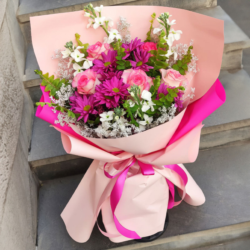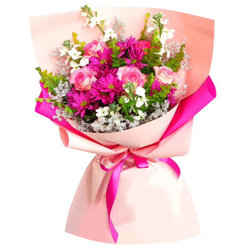 Этот букет из розовых роз, белой маттиолы и розовой кустовой хризантемы с добавлением сухоцветов создаёт нежное и романтичное настроение. Цветы аккуратно завернуты в матовую плёнку пастельного розового цвета и украшены яркой розовой лентой. Композиция подарит атмосферу легкости и радости, отлично подойдёт для встречи из поездки. Создан для того, чтобы порадовать любимую женщину.