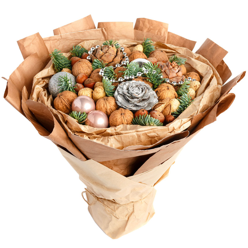 Этот букет создаёт тёплую атмосферу благодаря натуральным оттенкам орехов и зелени. В составе — грецкий орех, арахис, миндаль, фундук, пихта, шишки и декоративные шары. Упакован в крафт-бумагу, что подчёркивает его естественность и элегантность. Идеальный подарок для крестницы на День знаний, создающий атмосферу уюта и радости.