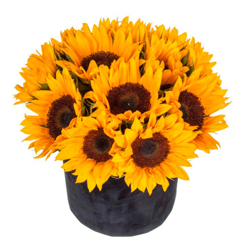 Яркие жёлтые подсолнухи создают атмосферу радости и тепла. Каждый цветок излучает солнечный свет и жизненную силу. Композиция оформлена в стильной бархатной шляпной коробке глубокого чёрного цвета. Это великолепный подарок для любимой женщины на День Святого Валентина.