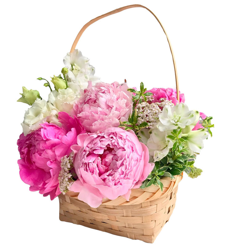 Эта композиция из розовых и белых пионов, белой эустомы и поттоспорума создает атмосферу нежности и свежести. Цветы аккуратно уложены в плетёную корзину, которая придаёт композиции очаровательный деревенский стиль. Такой букет станет великолепным украшением на выпускной бал и идеальным подарком для внучки.