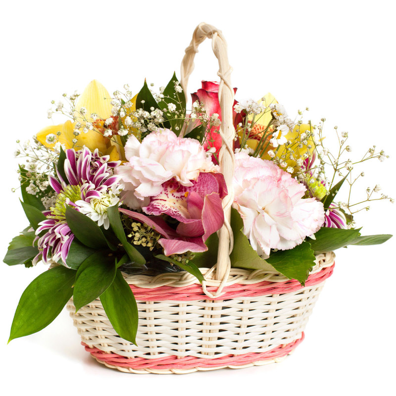 Эта яркая цветочная композиция объединяет розовые и жёлтые орхидеи, розовые гвоздики, розовые розы, фиолетовые хризантемы и гипсофилу. Все цветы собраны в плетёную корзину, создавая элегантный и праздничный вид. Корзина с цветами станет идеальным украшением для любого события и порадует получателя своей свежестью и красотой. Прекрасный подарок для любимой женщины на День матери.