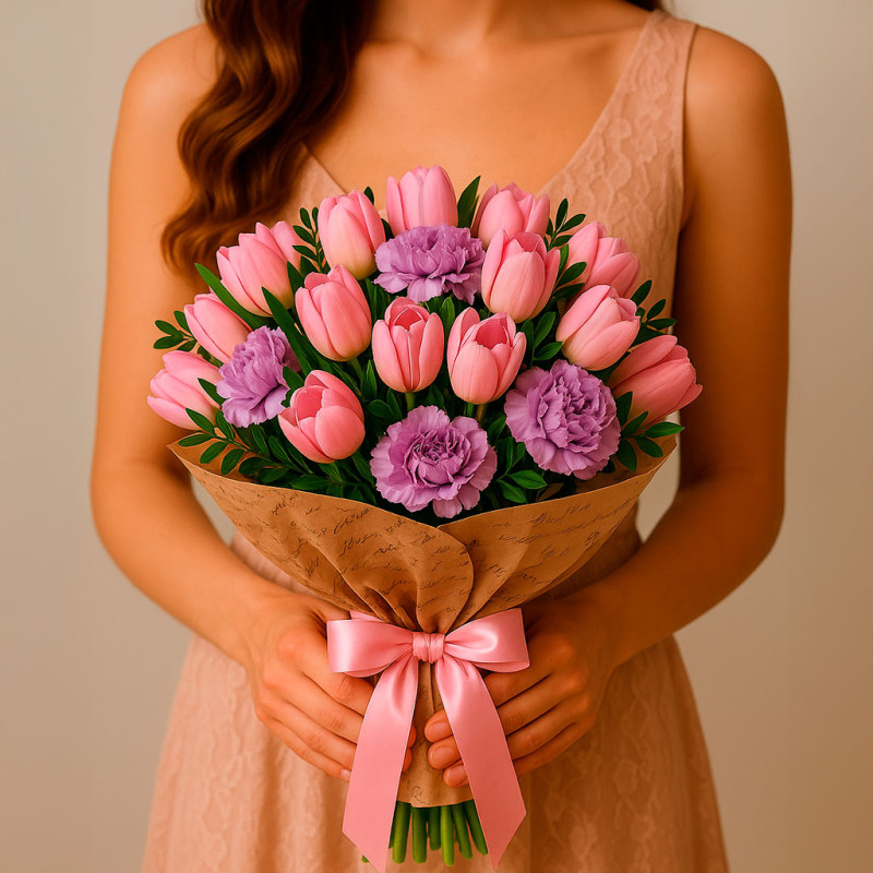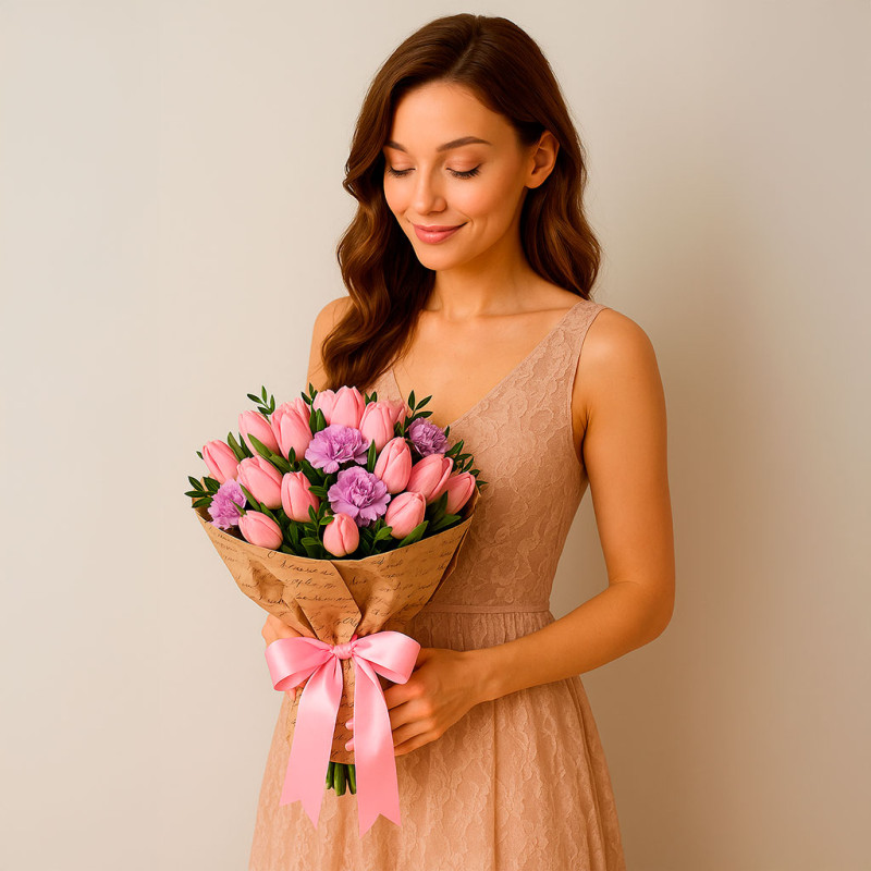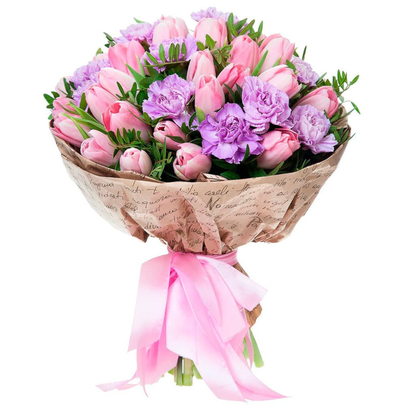 Нежные розовые тюльпаны и сиреневые гвоздики создают атмосферу утончённой романтики. Композиция дополнена сочной зеленью фисташки. Букет оформлен в крафт-бумагу с изящным рисунком и перевязан розовой атласной лентой. Эта цветочная композиция создаёт атмосферу нежности и будет отличным подарком для любимой на свидание.