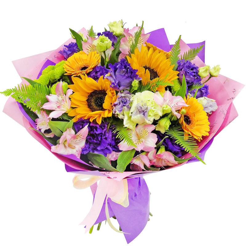 Яркие и насыщенные цвета этого букета вызывают радость и вдохновение. В его составе подсолнух, фиолетовая эустома, розовая альстромерия, зеленая кустовая хризантема и аспарагус. Упаковка выполнена из матовой пленки и крафт-бумаги с добавлением сетки, дополнена нежной лентой. Этот букет создаёт атмосферу весеннего праздника и идеально подойдёт для поздравления любимой на День влюблённых.