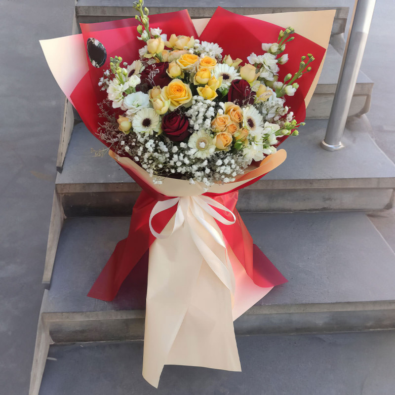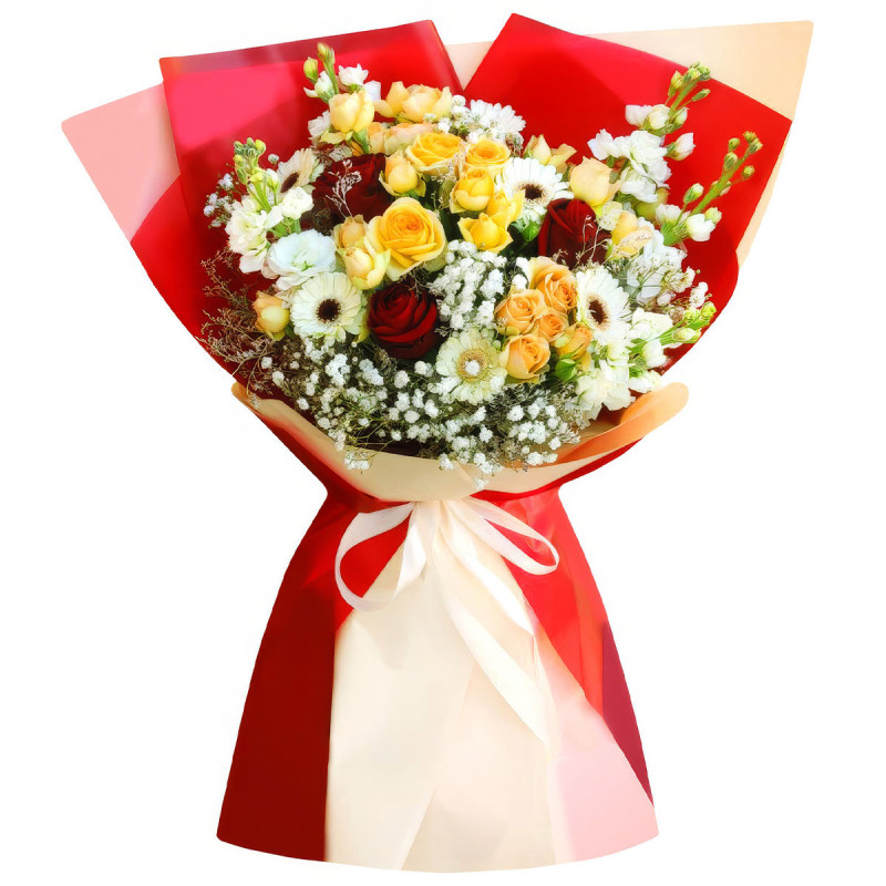 Этот букет дарит радость своими яркими цветами: красные и желтые розы, белая маттиола, мини гербера, гипсофила и лимониум. Композиция оформлена в красную и бежевую матовую пленку, перевязанную атласной лентой. Букет создает атмосферу праздника и тепла. Идеально подойдет для поздравления любимой женщины на 8 Марта.