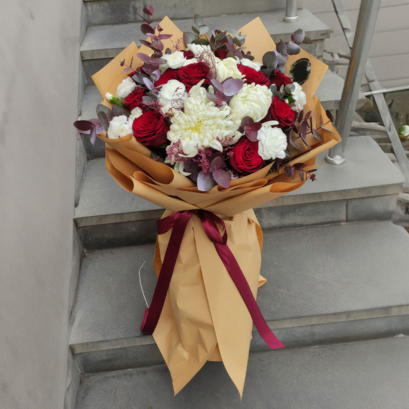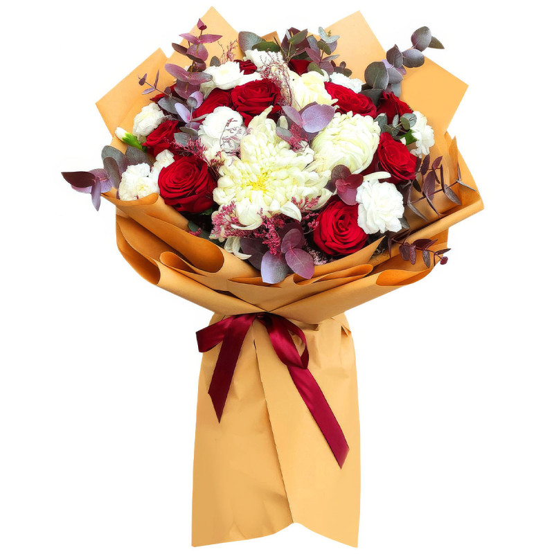 Элегантное сочетание белого и красного цветов придаёт букету особую утончённость. В составе: белая одноголовая хризантема, красная одноголовая роза, белая маттиола и эвкалипт. Упакован в крафт-бумагу с бордовой лентой, что подчёркивает его изысканность. Этот букет создает атмосферу торжества и радости. Прекрасный подарок для жены на годовщину.