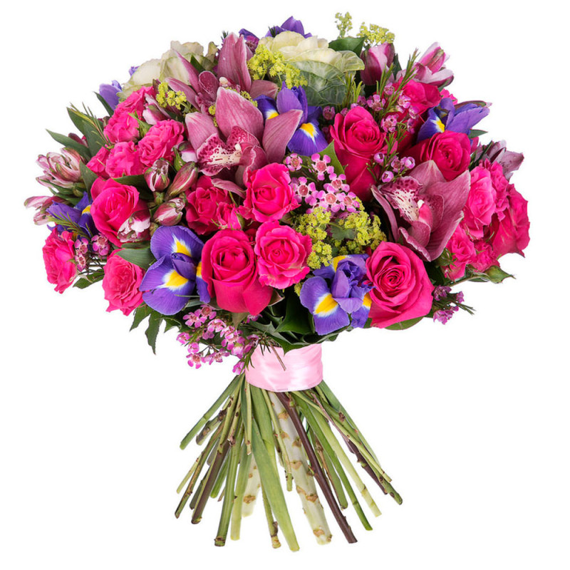 Яркие розовые и фиолетовые оттенки создают атмосферу радости и веселья. В составе: роза одноголовая розовая, ирис, альстромерия розовая, орхидея розовая, статица, роза кустовая розовая, ваксфлауэр и брассика. Букет обёрнут в матовую плёнку и перевязан розовой атласной лентой. Эта композиция создаёт праздничное настроение, идеально подходит для встречи из поездки и порадует любимую женщину.