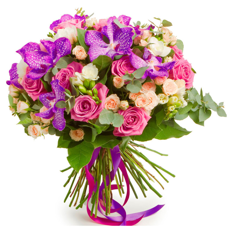 Яркие оттенки фиолетового и кремового создают атмосферу загадки. В составе: ванда, кремовая кустовая роза, розовая одноголовая роза, белая фрезия и эвкалипт. Упакован в матовую плёнку с атласной лентой, придающей завершённый вид. Этот букет подарит радость на юбилей и станет идеальным сюрпризом для подруги.