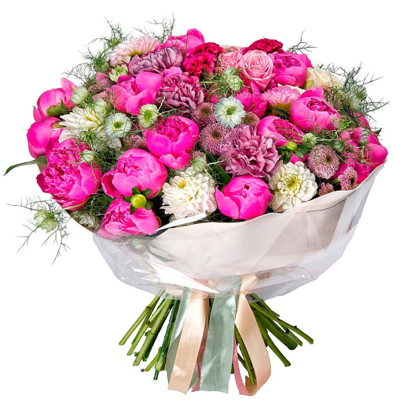 Яркие розовые и сиреневые оттенки вызывают чувство нежности и радости. В букете собраны розовые пионы, розовые гвоздики, сиреневые кустовые хризантемы, белые георгины и зелень. Упаковка выполнена из матовой и прозрачной плёнки и перевязана атласной лентой нежных оттенков. Композиция создаёт атмосферу романтики и утончённости. Подходит для подарка любимой на романтический вечер.
