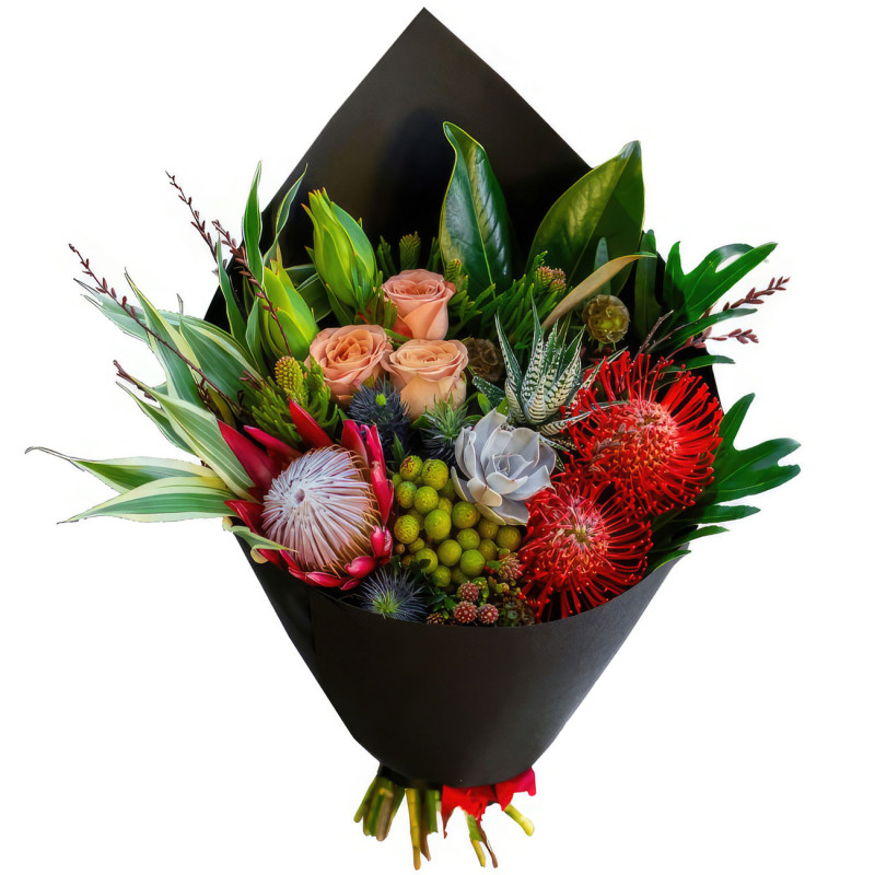 Яркие оттенки розового, красного и зелёного создают выразительную цветовую палитру. Букет состоит из эрингии, протеи, леукоспермума, одноголовых роз Капучино, эхеверии, скабиоз, леукодендрона, лагуруса и брунии, дополненных декоративными листьями и зеленью. Упакован в стильную чёрную матовую плёнку, придающую композиции современный вид. Этот букет станет изысканным подарком для коллеги на повышение.