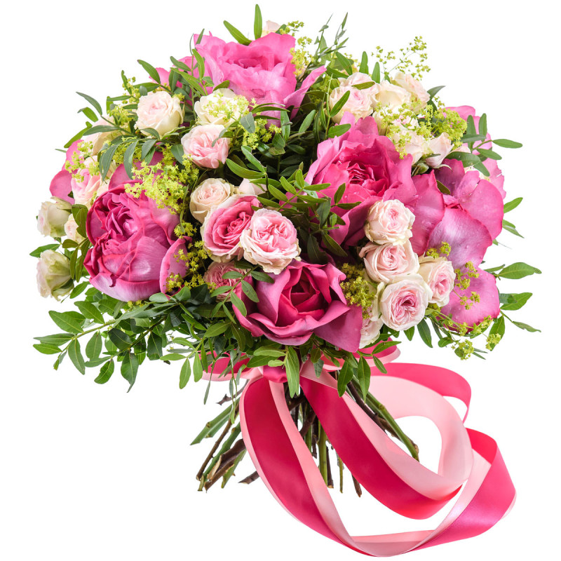 Яркие розовые и белые тона создают атмосферу нежности и романтики. Букет состоит из одноголовых розовых роз и кустовых белых роз, дополненных фисташкой и зеленью. Украшен широкой атласной лентой в тон цветам. Эта композиция станет идеальным подарком для любимой на романтический вечер.